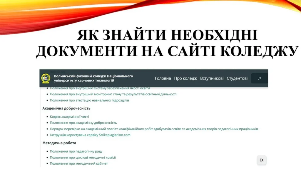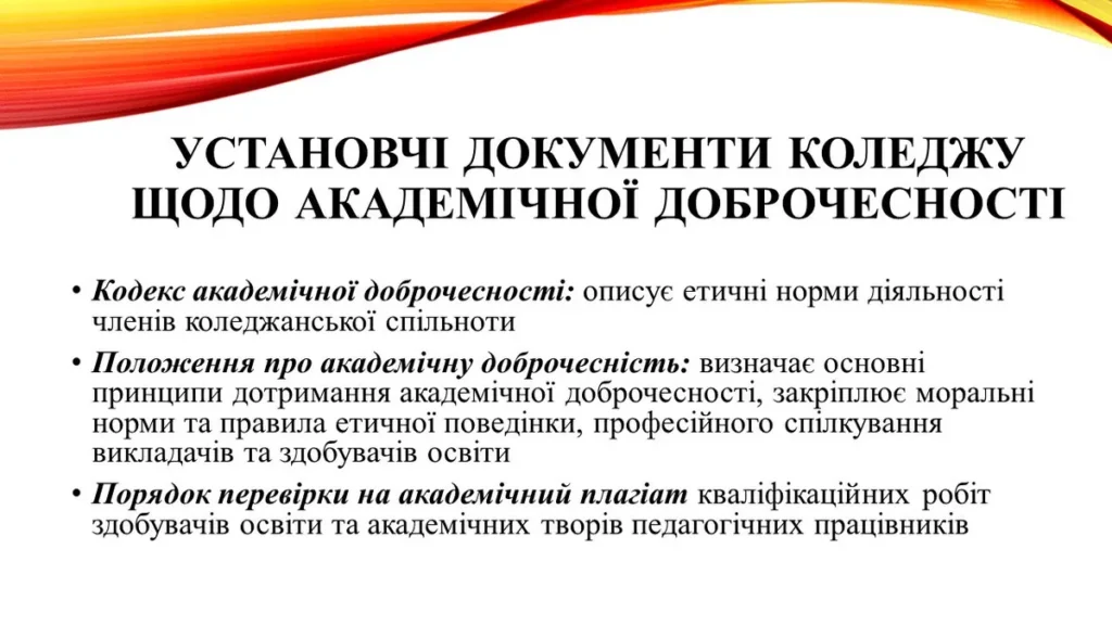 Протягом зустрічі учасники ознайомилися з основними принципами академічної доброчесності, нормативними документами коледжу, які регламентують дотримання академічної доброчесності в коледжі, різними аспектами процедури перевірки текстів на наявність академічного плагіату. Особливу увагу було приділено нормативним документам коледжу, які регулюють питання академічної доброчесності.
