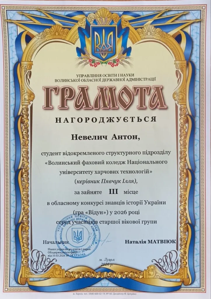 Студент Волинського фахового коледжу Національного університету харчових технологій Антон Невелич здобув почесне ІІІ місце в обласному конкурсі знавців історії України — інтелектуальній грі «Відун». У змаганні взяли участь найкращі знавці історії з різних навчальних закладів області, а боротьба за перемогу була напруженою та вимагала глибоких знань, логічного мислення та швидкої реакції.