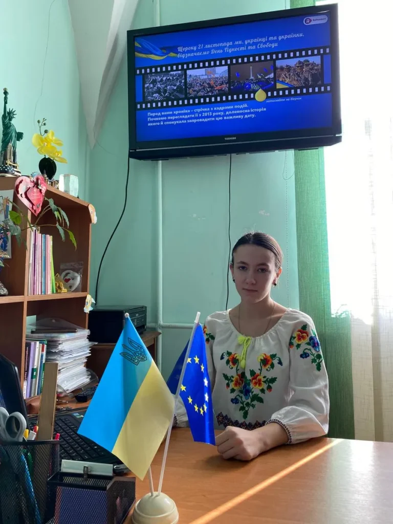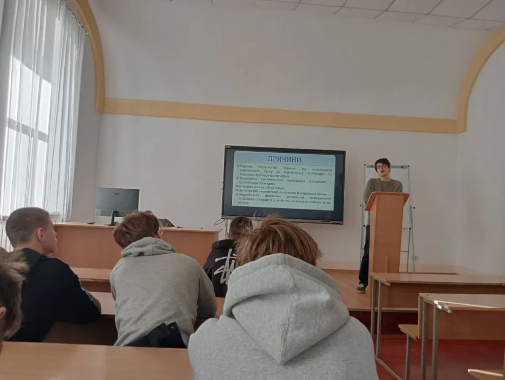 Студенти переглянули тематичні матеріали, обговорили ключові події Революції Гідності й розглянули символи, що стали знаковими для цього етапу української історії: жовто-блакитні стрічки, намети, прапори, барикади, мистецькі плакати та інші прояви громадянського спротиву. Учасники ділилися власними думками про цінності демократії та свободи, а також міркували над тим, що сьогодні означає бути гідними громадянами України та Європи.