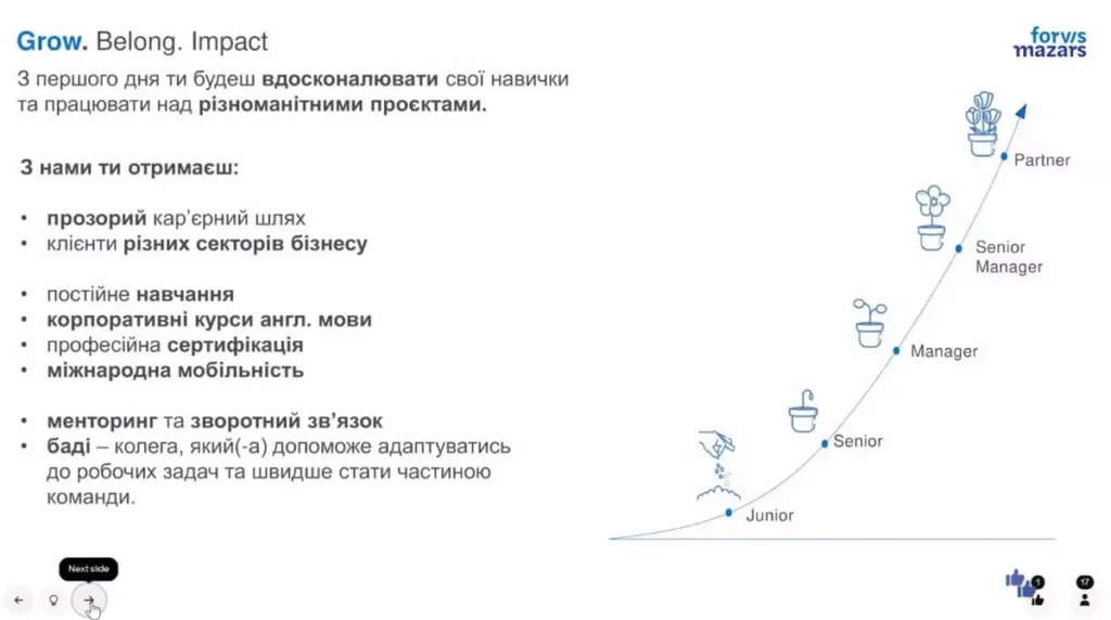 Представники Forvis Mazars поділилися реальним досвідом роботи у міжнародному середовищі, розповіли про особливості професії аудитора, вимоги роботодавців до молодих фахівців та етапи побудови успішної кар’єри.