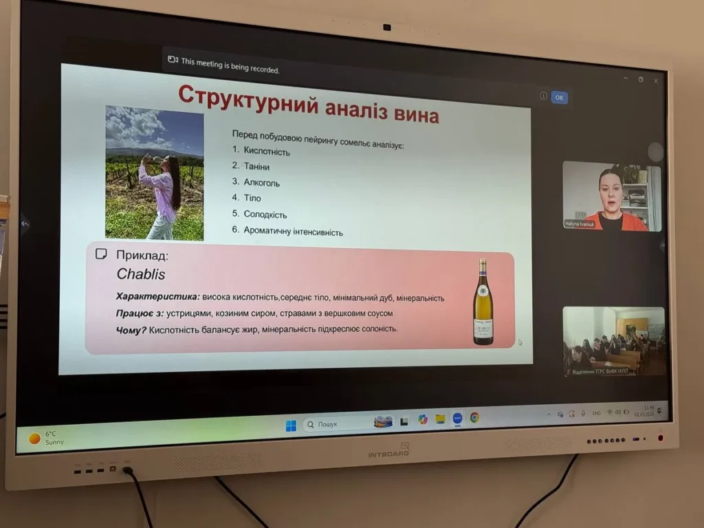 As part of the educational component “Bar Business and Sommelier Organization” for students of the Volyn Professional College, a guest online lecture was held on the topic “Food Pairing in the World of Wine: Theoretical Foundations.” The speaker at the event was Halyna Ivaniuk, sommelier at Citronelle restaurant, an ambassador for Ukrainian wines and champagne, and an expert with many years of practical experience in restaurant service and wine culture. During the lecture, students learned about the theoretical foundations of food pairing, the art of harmoniously combining food and drink.