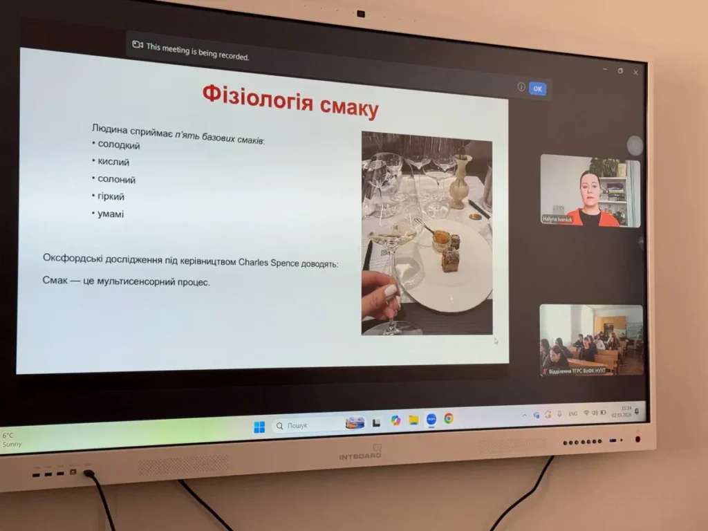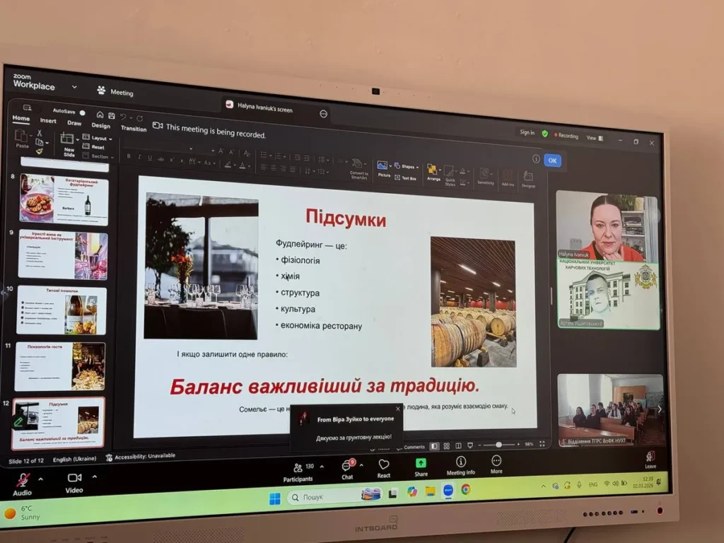 Галина Іванюк наголосила на важливості розуміння хімії смаку, ролі ароматики та післясмаку у формуванні загального гастрономічного враження. Вона поділилася практичними прикладами з професійної діяльності, пояснивши, як правильно аналізувати смаковий профіль страви та вина перед створенням гармонійної пари. Особливий інтерес у студентів викликали рекомендації щодо популяризації українських вин та формування культури їх споживання у закладах ресторанного господарства. Спікерка акцентувала увагу на необхідності постійного самовдосконалення, дегустаційної практики та вивчення міжнародного досвіду.