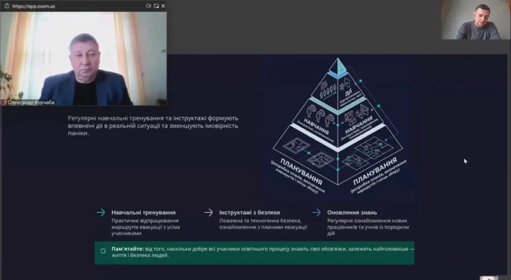 Викладач Захисту України, Віктор Кондратюк продемонстрував присутнім порядок евакуації під час надзвичайних ситуацій, детально проаналізував алгоритм дій педагогічних працівників та здобувачів освіти при виникненні пожежі, повітряної тривоги, техногенних аварій та інших надзвичайних ситуацій, звернувши особливу увагу на злагодженості дій, швидкості реагування та дотриманні правил безпеки.