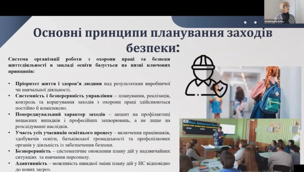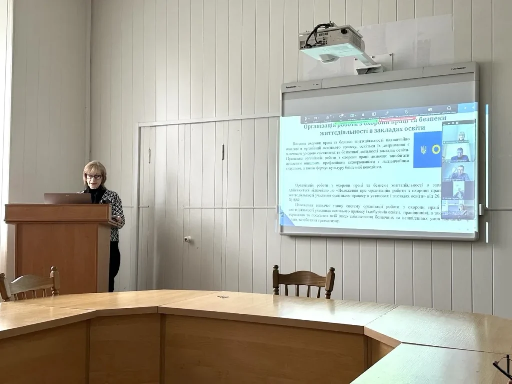 Доповідачка акцентувала увагу на системному підході до створення безпечного освітнього середовища, висвітлила питання нормативно-правового забезпечення охорони праці в закладах освіти, наголосила на необхідності систематичного проведення навчань, інструктажів з охорони праці, безпеки життєдіяльності та перевірки знань учасників освітнього процесу щодо дотримання вимог безпеки, запобігання нещасним випадкам, формування відповідального ставлення до власного життя і здоров’я.