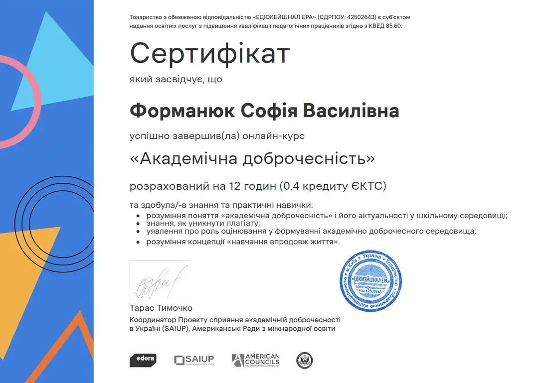 Compliance with legislation on academic integrity is an essential component of the educational process for training specialists in the hotel and restaurant business. This ensures that students acquire knowledge and skills responsibly, without violating ethical standards and intellectual property rights. To promote the principles of academic integrity, students enrolled in an online course titled “Academic Integrity” on the EdEra platform. Upon successful completion of the course, they received informal education certificates confirming their competence in academic integrity, which can serve as additional proof of professional responsibility in learning and research activities.