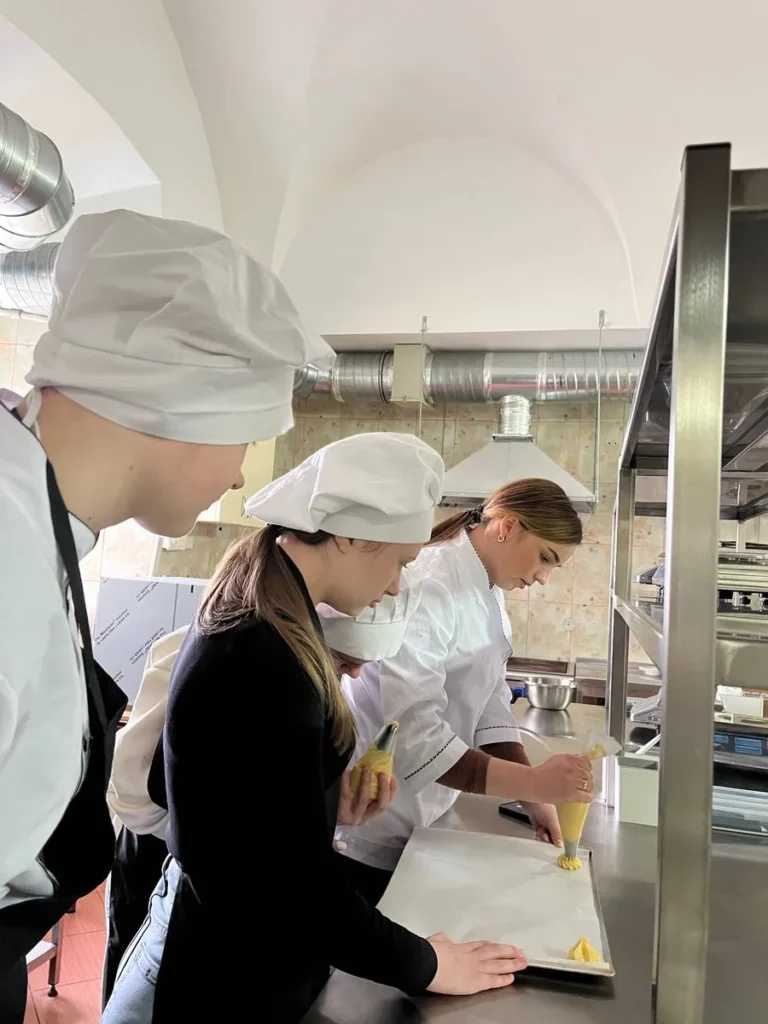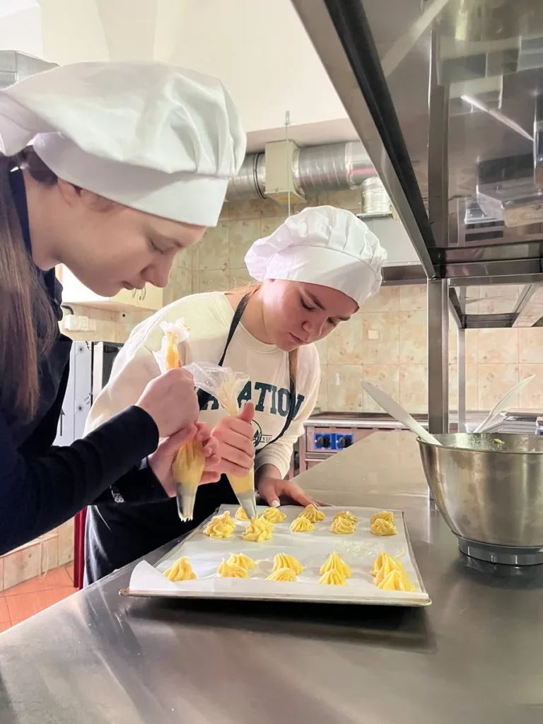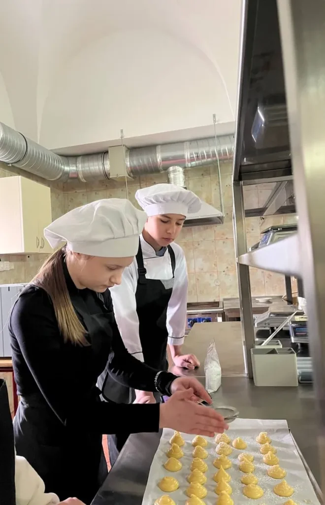 Особливу зацікавленість викликала практична частина, під час якої студенти мали можливість власноруч працювати з тістом, відсаджувати заготовки та спостерігати за процесом випікання. Учасники також ознайомилися з варіантами начинок і сучасними підходами до декорування готових виробів.