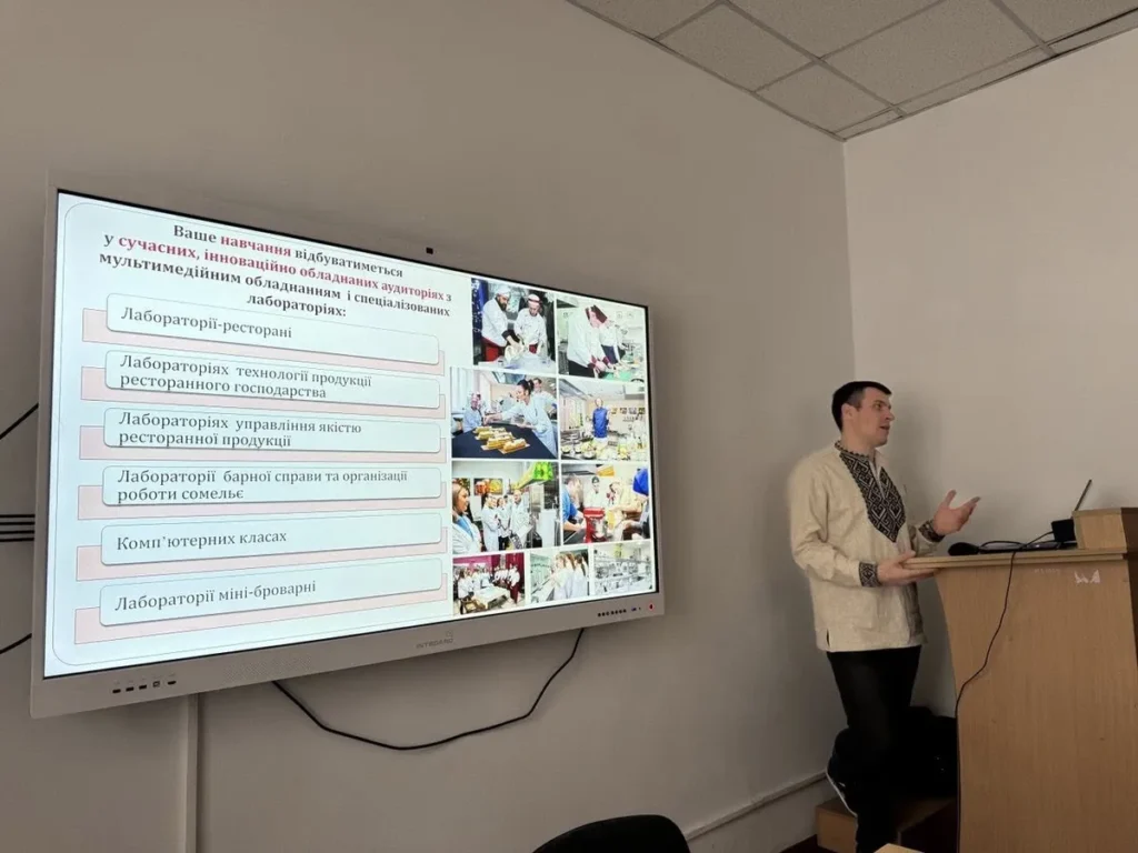 A career guidance event for students was held at the Volyn Professional College of the National University of Food Technologies, conducted by Oleg Bortnichuk, associate professor of the Hotel and Restaurant Business Department at the National University of Food Technologies. The event aimed to familiarize students with further education opportunities, the specifics of educational programs, and career prospects in the hotel and restaurant industry.
