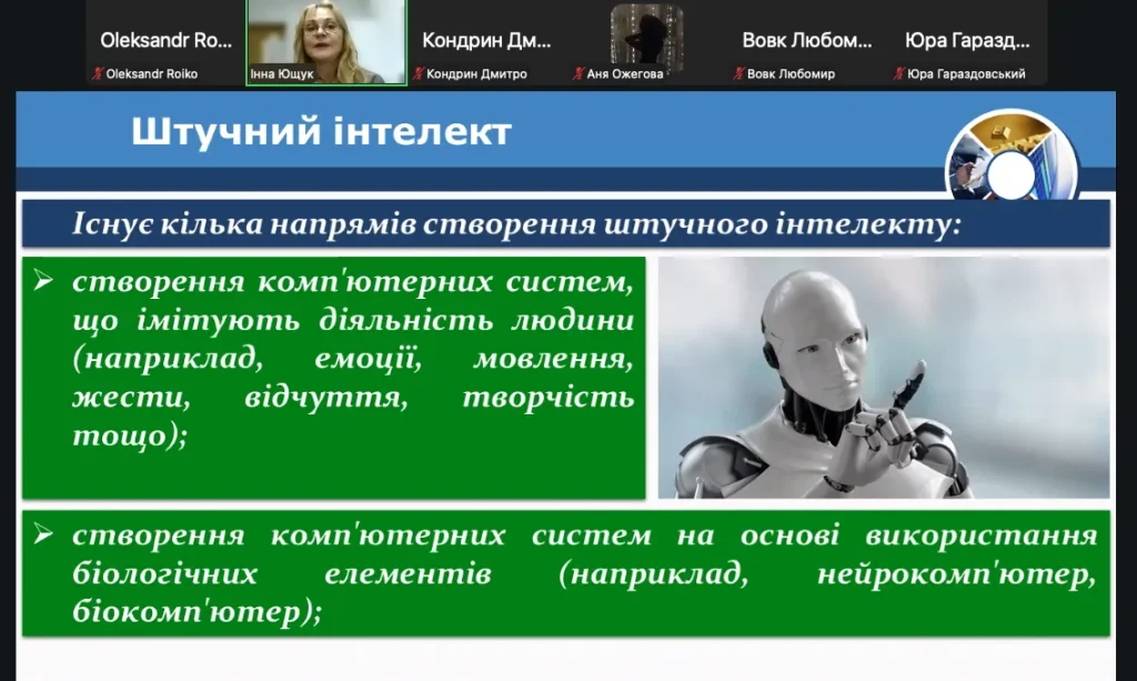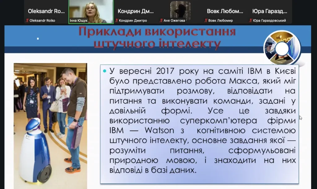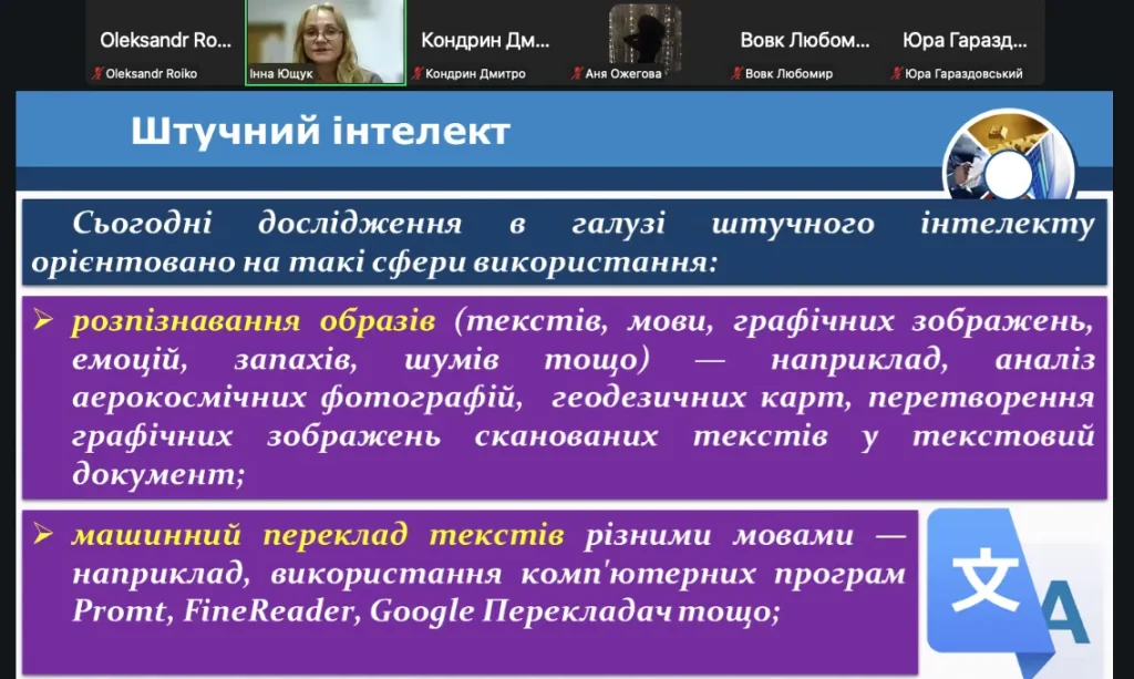Лектор детально розповіла про сфери застосування штучного інтелекту, зокрема про розпізнавання образів (текстів, мови, графічних зображень, емоцій, запахів, шумів), машинний переклад текстів різними мовами з використанням програм на кшталт Promt, FineReader, Google Перекладач. Особливо важливим виявилося обговорення створення комп’ютерних систем, що імітують діяльність людини, включаючи емоції, мовлення, жести, відчуття та творчість.