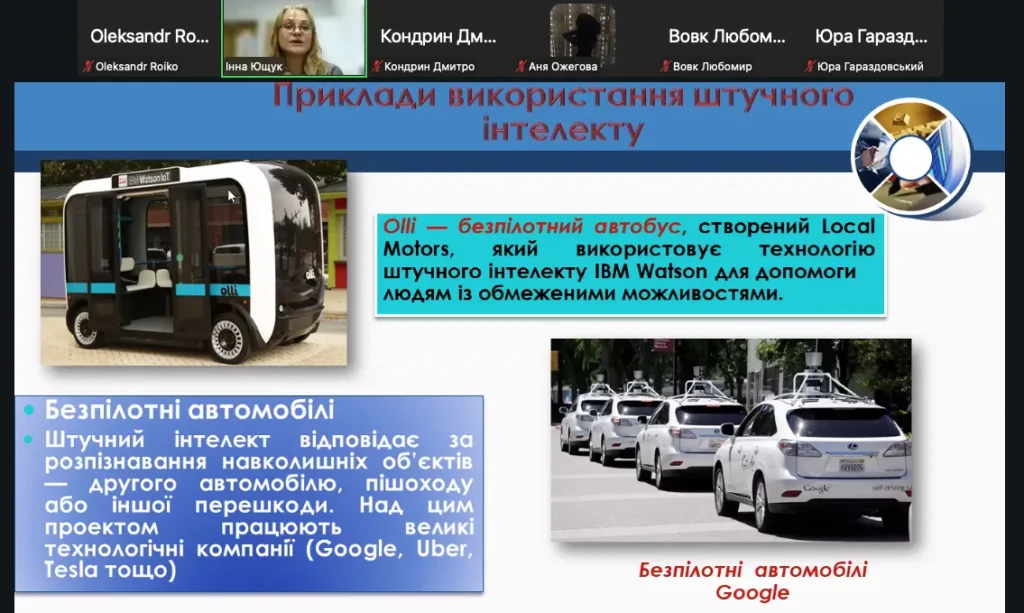 Особливу увагу було приділено реальним застосуванням технологій ШІ. Слухачі дізналися про безпілотні автомобілі, які використовують штучний інтелект для розпізнавання навколишніх об’єктів, та про проєкт Olli – безпілотний автобус, створений Local Motors із використанням когнітивної системи IBM Watson для допомоги людям з обмеженими можливостями. Також було розглянуто досвід великих технологічних компаній, таких як Google, Uber та Tesla, у розробці автономного транспорту.