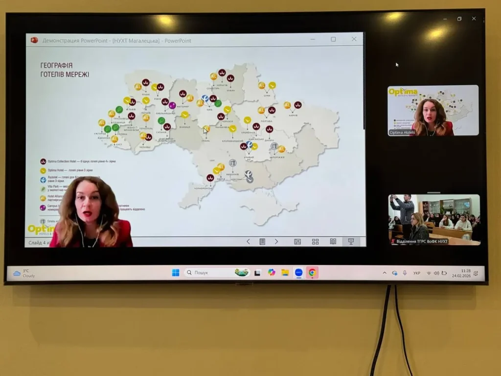 Здобувачі освітньо-професійної програми «Готельно-ресторанна справа» мали унікальну можливість прослухати лекцію керівниці навчального центру Optima Hotels & Resorts, докторки технічних наук, Ірини Магалецької, присвячену технологічному процесу прийому та розміщення на підприємствах готельного господарства.