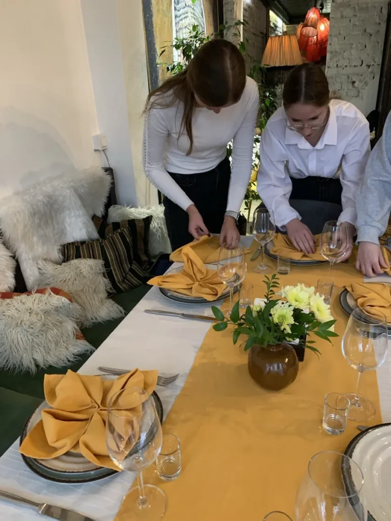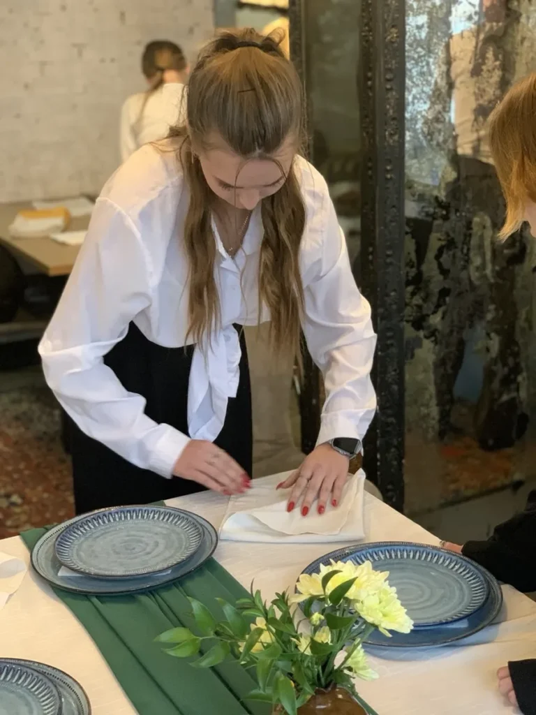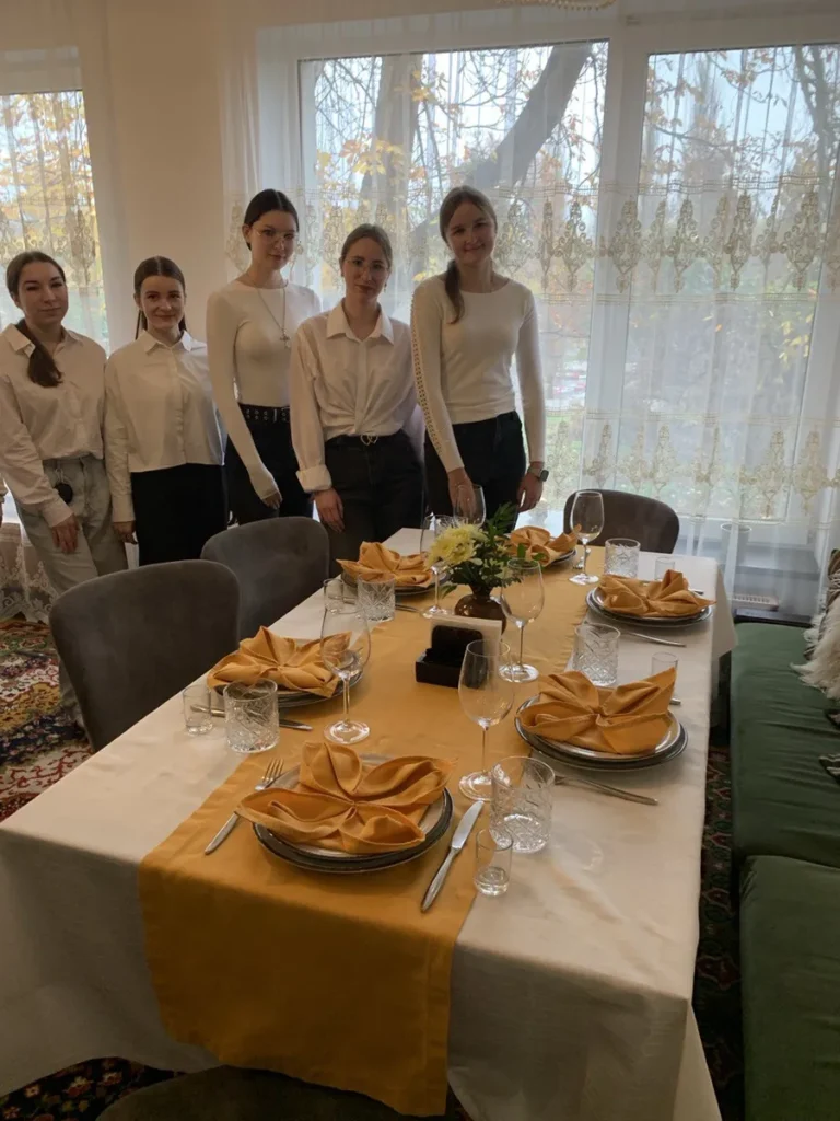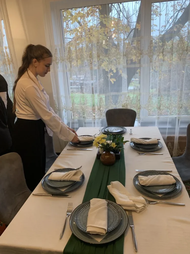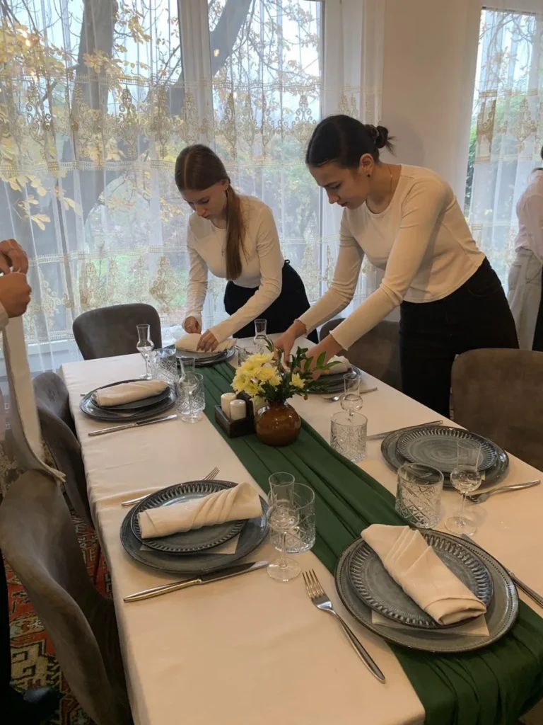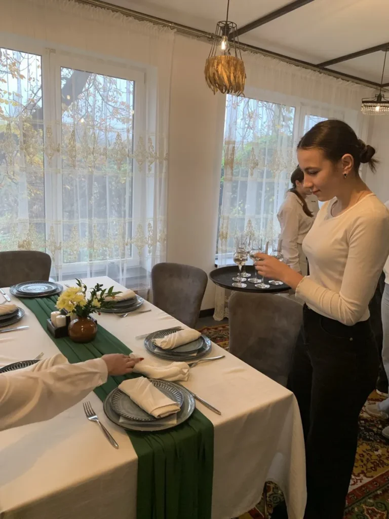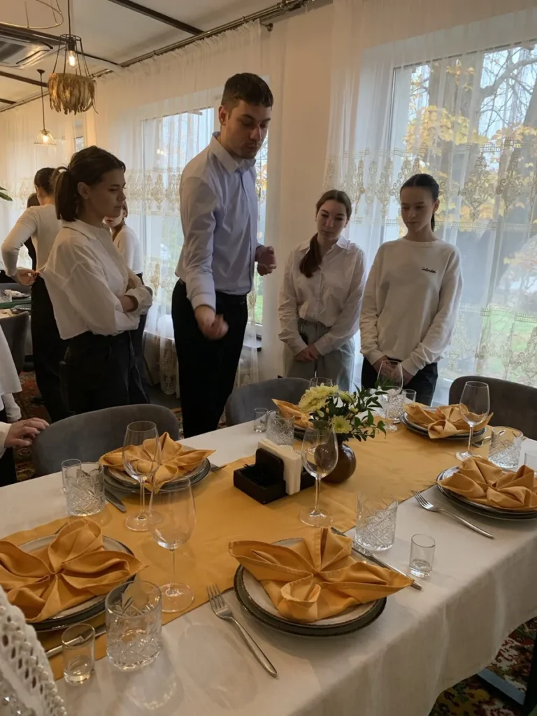 Під час заняття здобувачі освіти відпрацювали послідовність і техніку сервірування столів різних типів – від повсякденного до урочистого бенкетного. Особливу увагу було приділено правильному розміщенню елементів сервірування: тарілок, приборів, скла, серветок, декоративних деталей. Під керівництвом Олександра Батієвича студенти відпрацьовували професійні прийоми подачі страв, техніку роботи офіціанта, правила етикету під час спілкування з гостями та особливості обслуговування різних категорій відвідувачів.