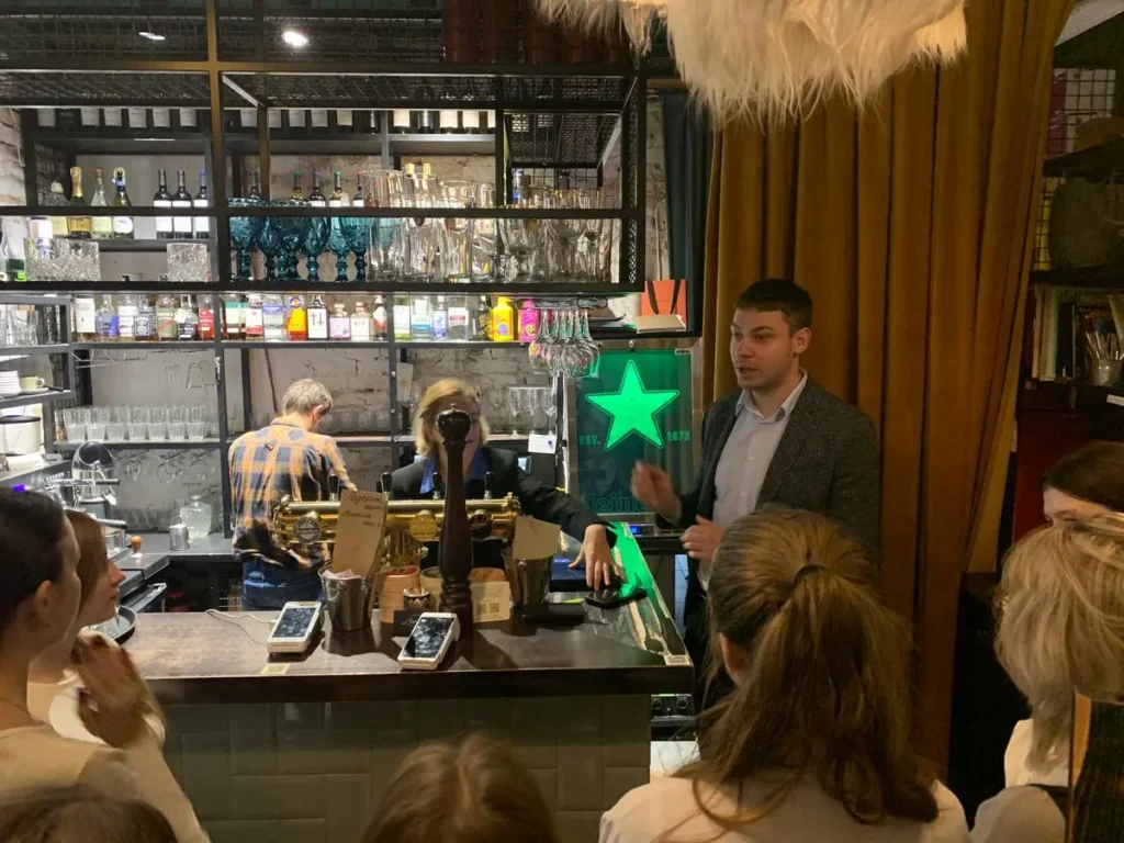 У процесі заняття-екскурсії здобувачі освіти ознайомилися з виробничо-торговельним середовищем закладу, відвідали торговельні й службові приміщення, побачили організацію робочих місць офіціантів, кухарів, барменів, дізналися про технологічне оснащення кухні та етапи приготування національних страв. Випускник поділився досвідом упровадження сучасних технологій обслуговування та дотримання стандартів санітарно-гігієнічної безпеки.
