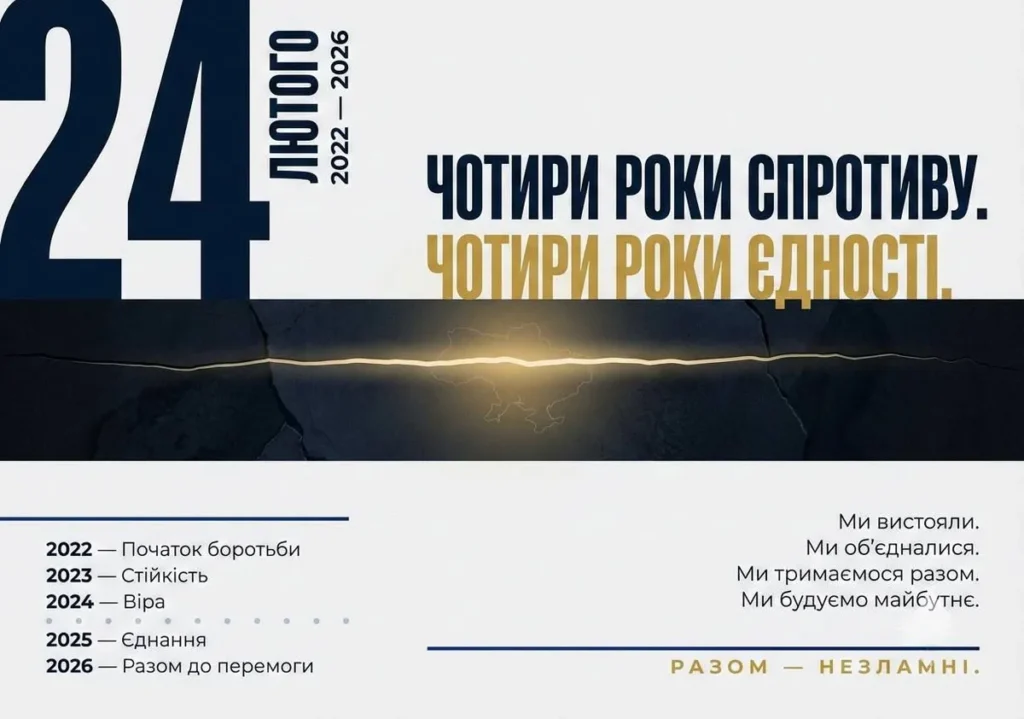 Чотири роки тому лютневий світанок приніс не весну, а війну. Україна прокинулася від вибухів, а українці — від усвідомлення, що свободу знову доведеться захищати. Тоді ворог був упевнений у швидкій перемозі. Але він не врахував головного — гідність і волю народу неможливо окупувати.
