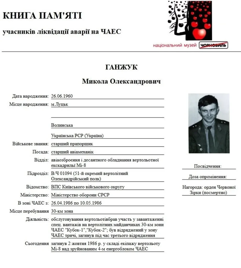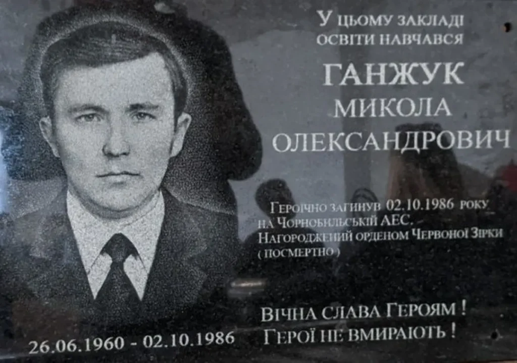 З перших днів після аварії на Чорнобильській АЕС він брав участь у ліквідації її наслідків. Виконуючи свій обов’язок, Микола Ганжук трагічно загинув разом з екіпажем вертольота Мі-8 На стіні коледжу встановлено меморіальну дошку на знак глибокої шани та вдячності. За проявлені мужність і героїзм він був посмертно відзначений державними нагородами.