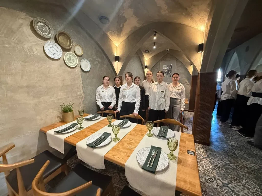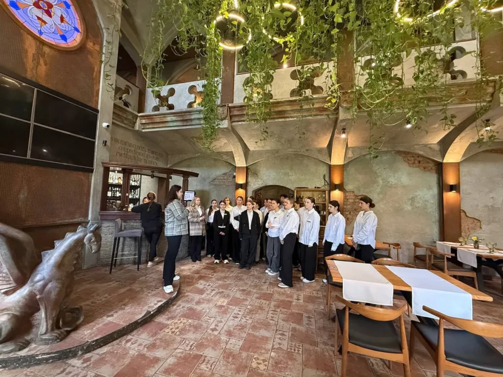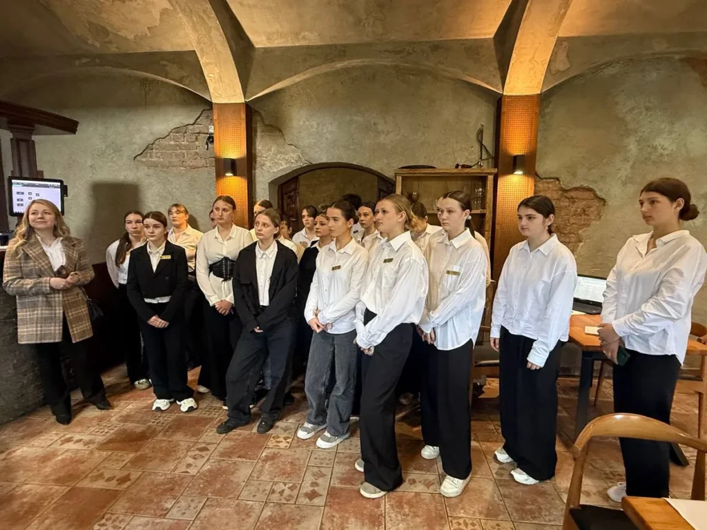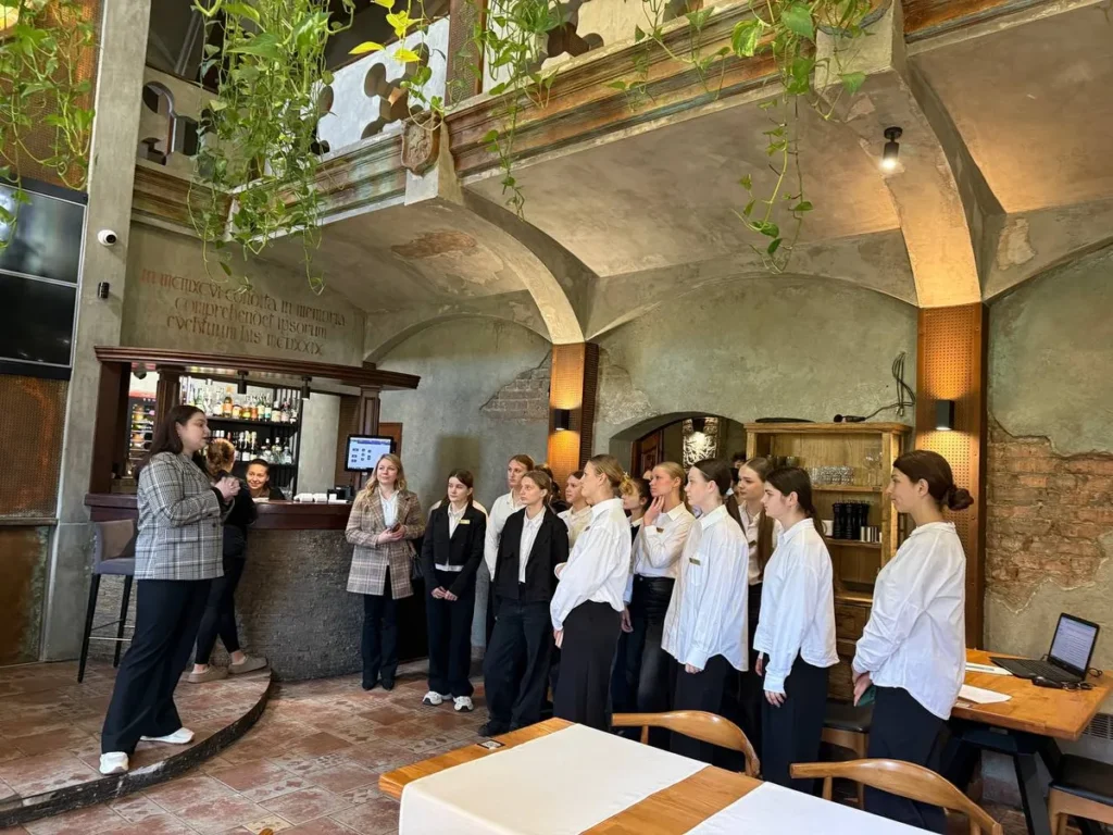 As part of the “Restaurant Management” course, second-year students in the “Hotel and Restaurant Business” professional education program took a field trip to the Korona Vitovta restaurant. The event was led by instructors Yuliia Sus and Tetiana Ishchyk. The excursion-based format allowed students to combine theoretical knowledge with firsthand experience of the operating conditions of a restaurant. During the visit, students had the opportunity to gain a deeper understanding of how a modern restaurant is organized, the specifics of guest service, and the structure of internal processes.